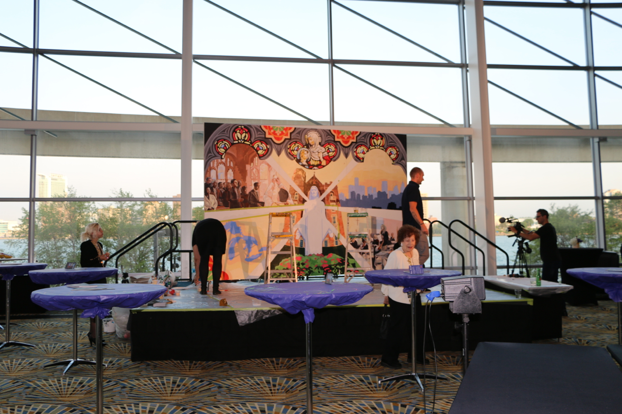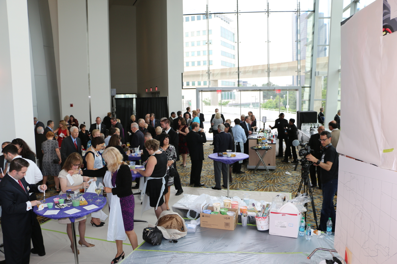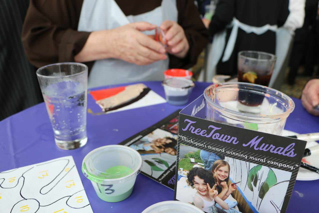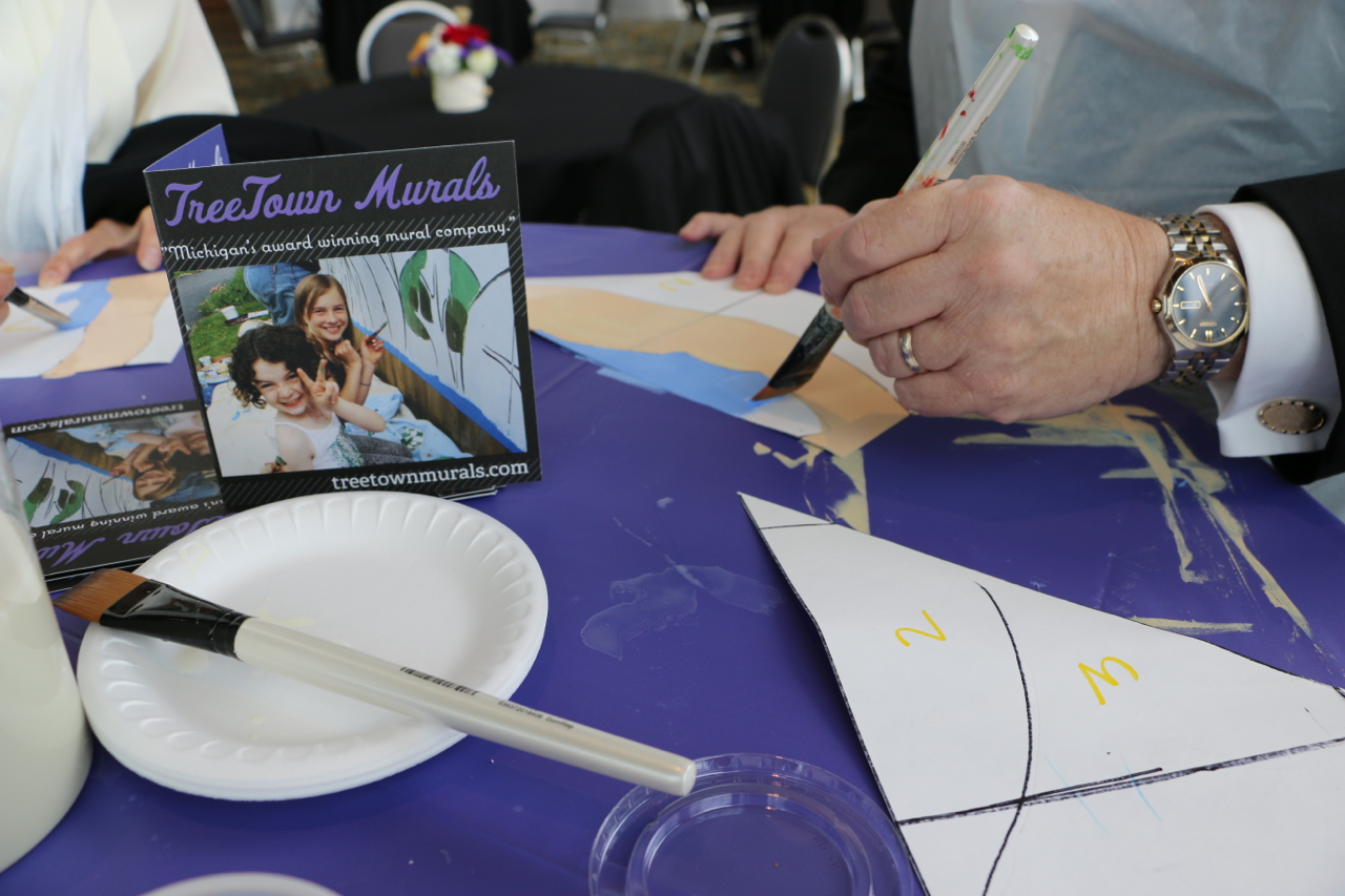 The Sacred Heart Seminary’s PBNC project was a huge success! TTM work with the event organizers to design, not only a unique mural for the seminary, but a truly original process for painting it. The painting crew at TTM designed a system so the mural could be both participatory and finished in one night. As one of the main attractions at this “Artful Gala” over 300 of the 850 guests made their personal mark on this legacy mural. The mural area, in Cobo Arena, was elegantly designed so the guests could participate in evening attire. Hightop tables displayed paintable squares with corresponding paint colors, guests happily and easily made their mark. The mural was unveiled to all 850 guests that night, it now lives at Sacred Heart Seminary in Detroit, MI.