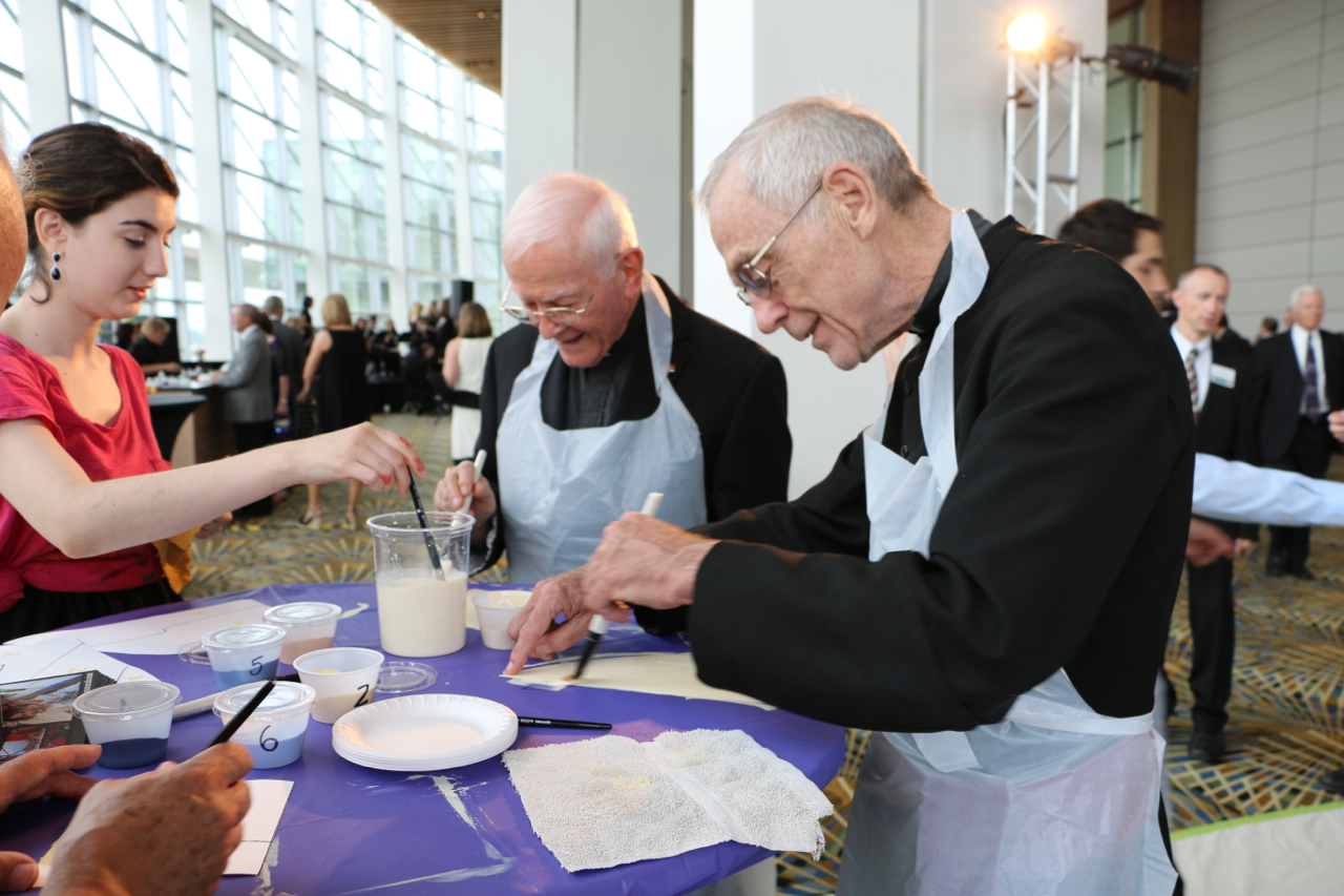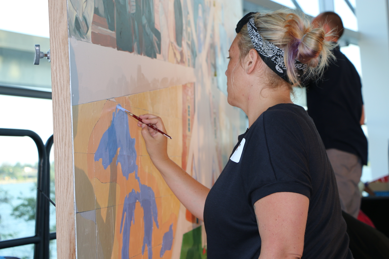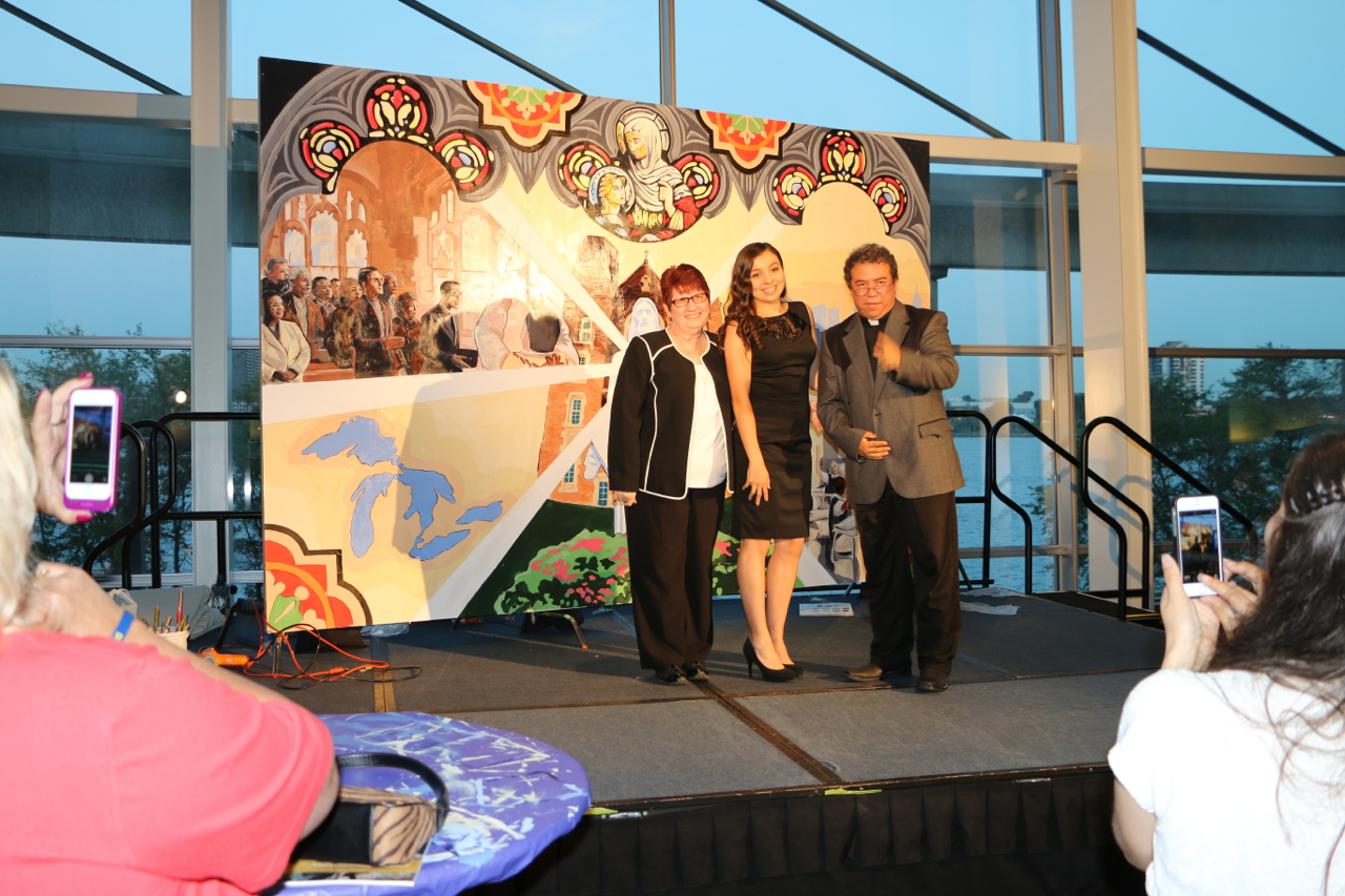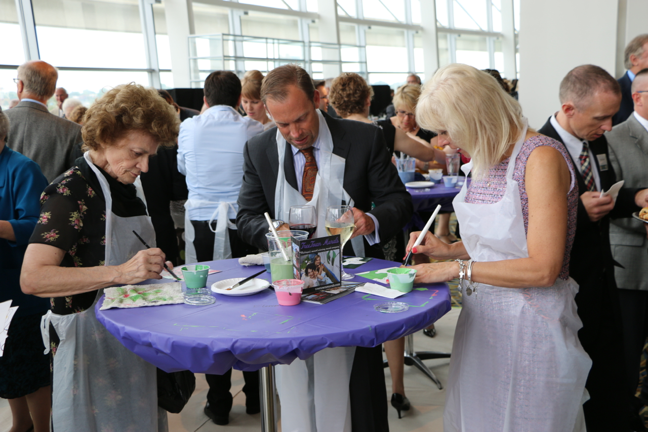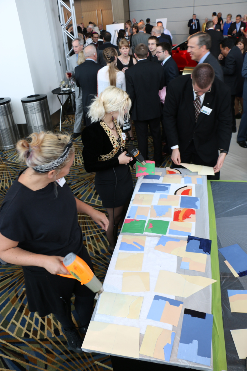 The Sacred Heart Seminary’s PBNC project was a huge success! TTM work with the event organizers to design, not only a unique mural for the seminary, but a truly original process for painting it. The painting crew at TTM designed a system so the mural could be both participatory and finished in one night. As one of the main attractions at this “Artful Gala” over 300 of the 850 guests made their personal mark on this legacy mural. The mural area, in Cobo Arena, was elegantly designed so the guests could participate in evening attire. Hightop tables displayed paintable squares with corresponding paint colors, guests happily and easily made their mark. The mural was unveiled to all 850 guests that night, it now lives at Sacred Heart Seminary in Detroit, MI.