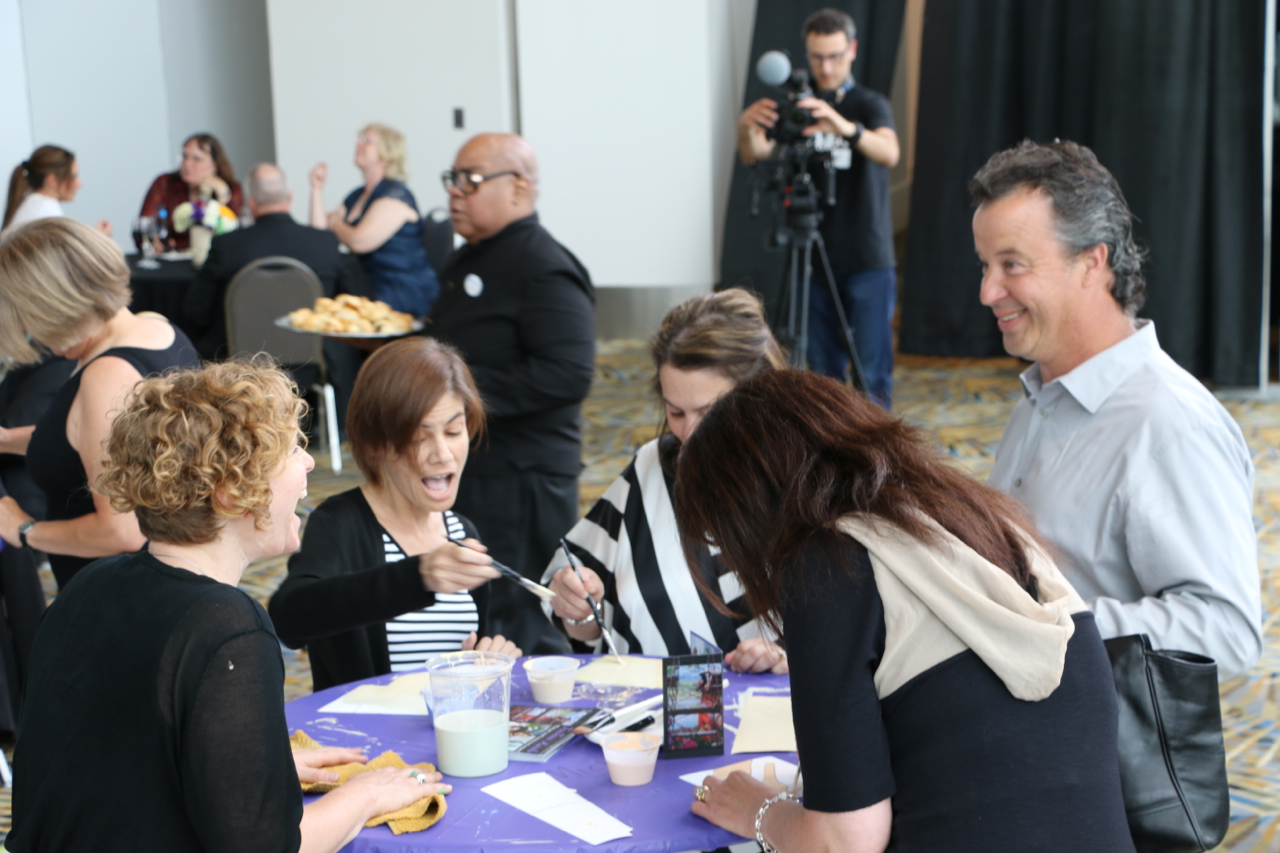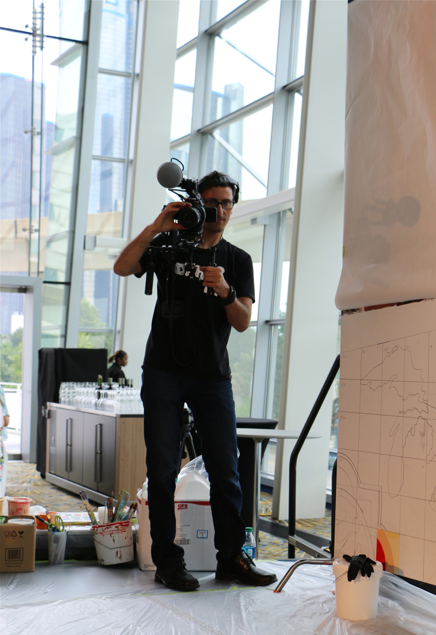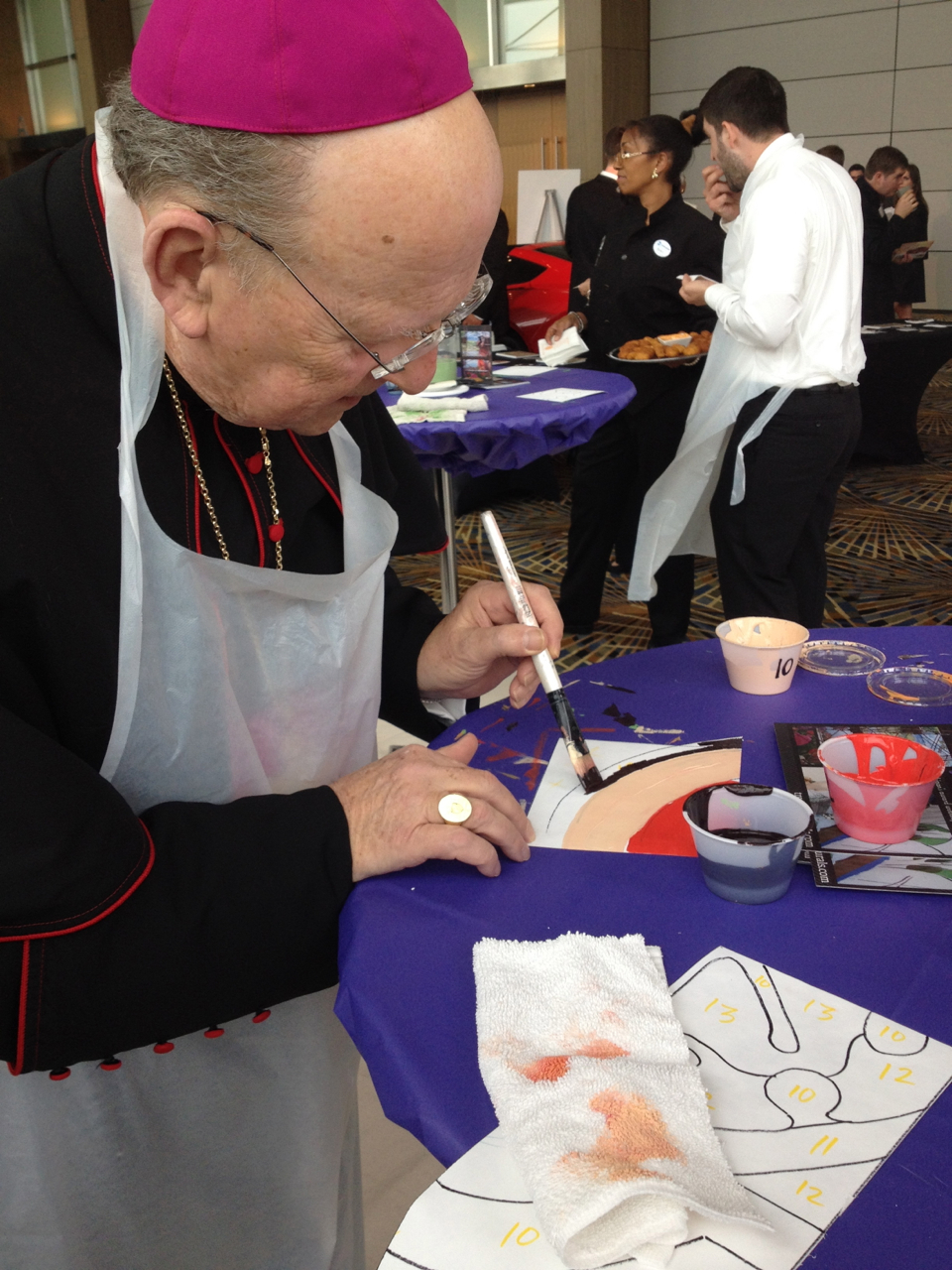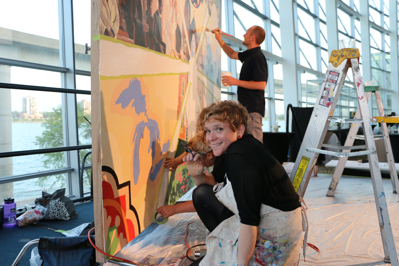 The Sacred Heart Seminary’s PBNC project was a huge success! TTM work with the event organizers to design, not only a unique mural for the seminary, but a truly original process for painting it. The painting crew at TTM designed a system so the mural could be both participatory and finished in one night. As one of the main attractions at this “Artful Gala” over 300 of the 850 guests made their personal mark on this legacy mural. The mural area, in Cobo Arena, was elegantly designed so the guests could participate in evening attire. Hightop tables displayed paintable squares with corresponding paint colors, guests happily and easily made their mark. The mural was unveiled to all 850 guests that night, it now lives at Sacred Heart Seminary in Detroit, MI.