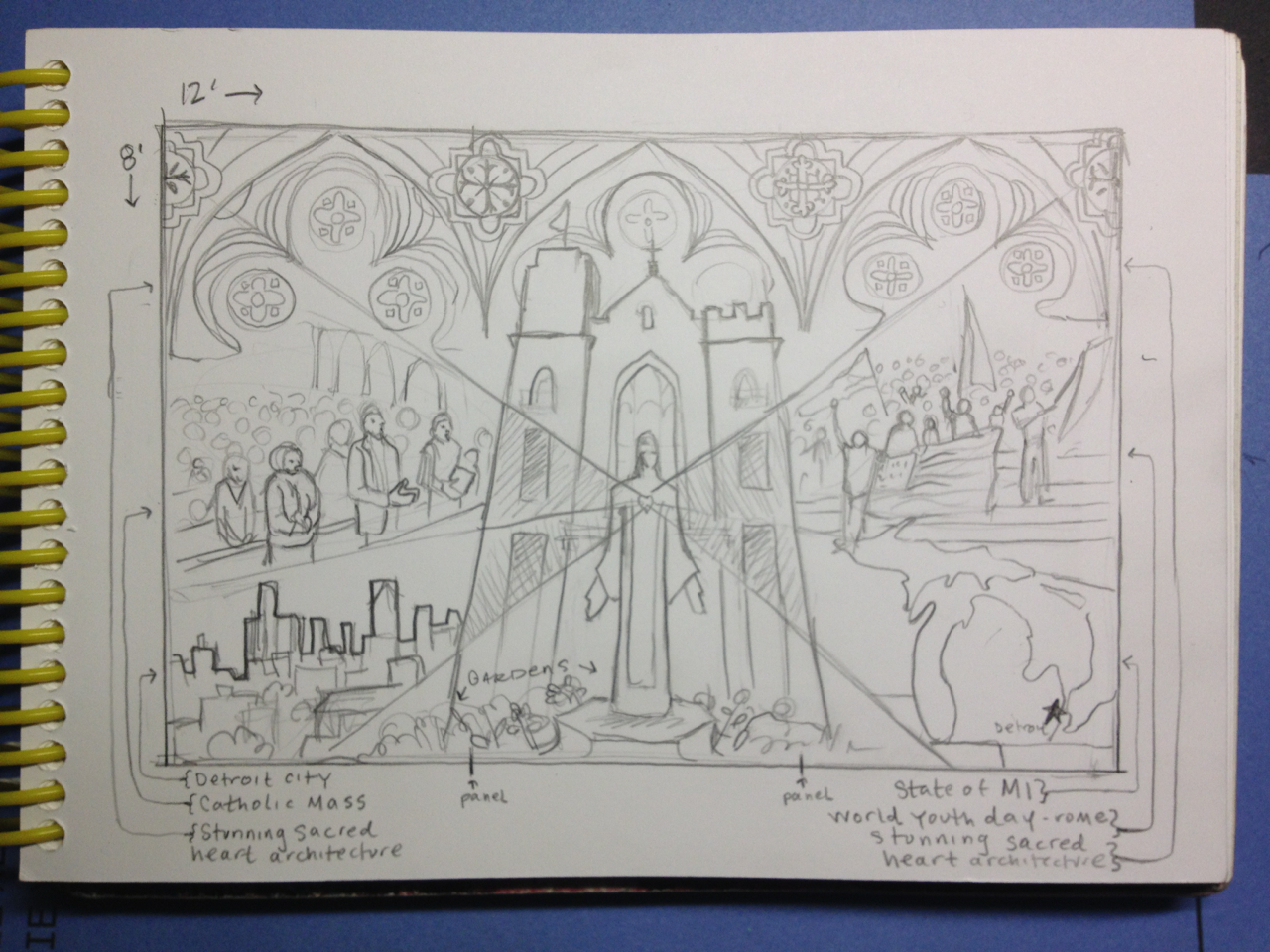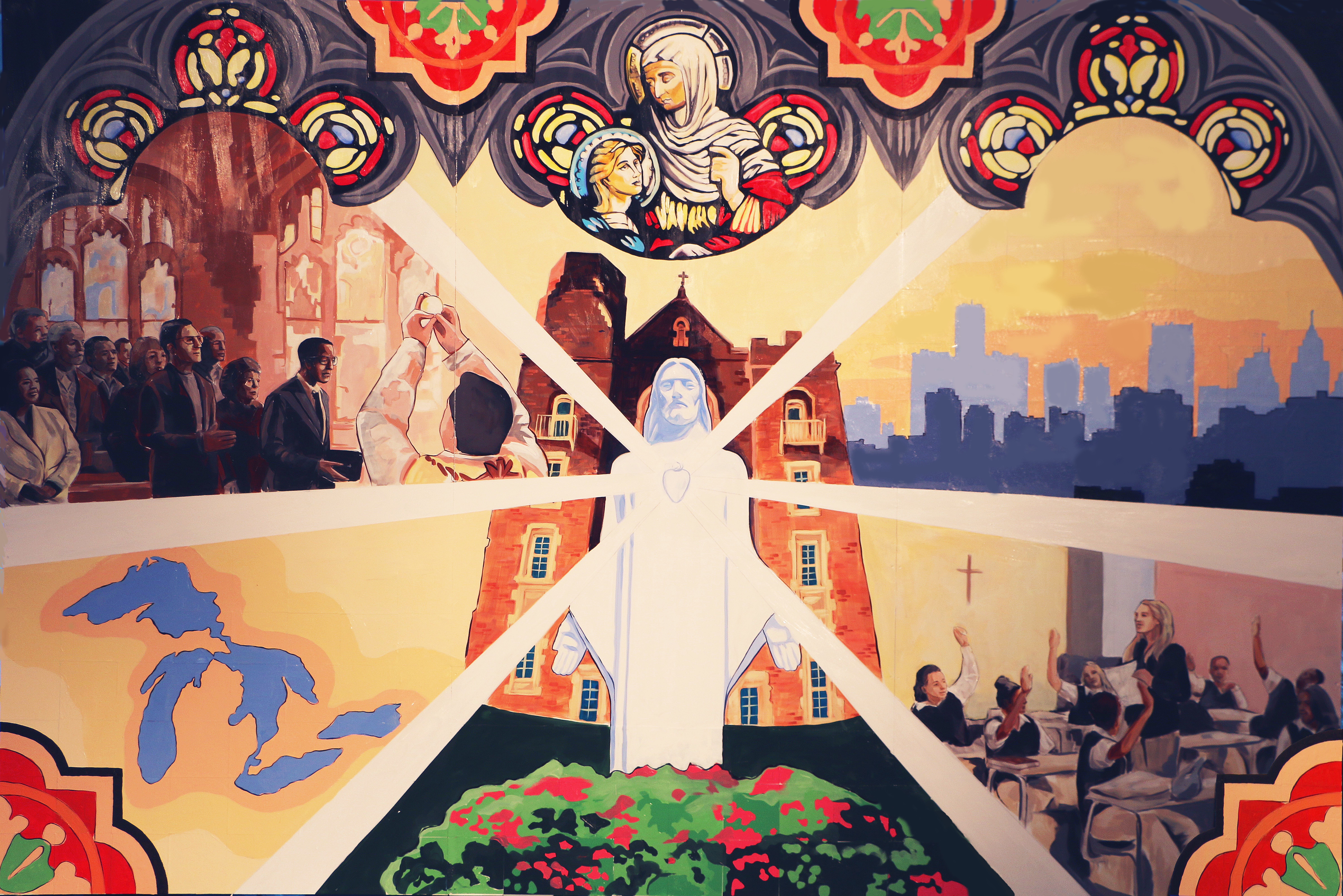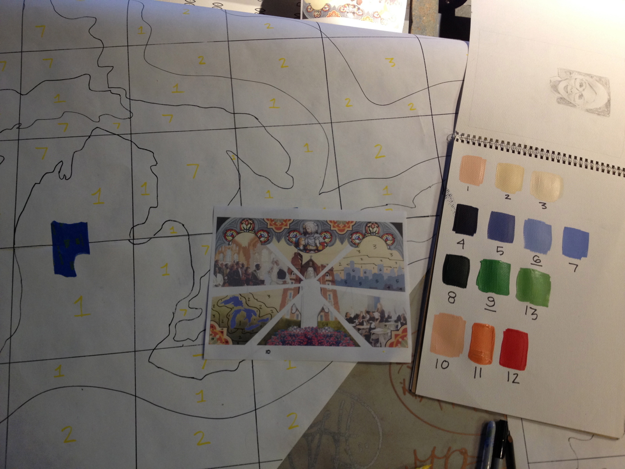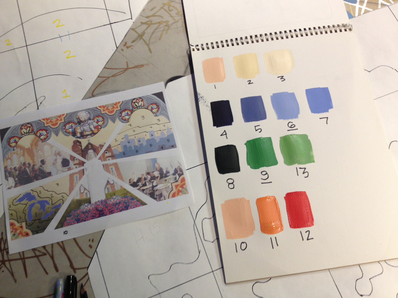 The Sacred Heart Seminary’s PBNC project was a huge success! TTM work with the event organizers to design, not only a unique mural for the seminary, but a truly original process for painting it. The painting crew at TTM designed a system so the mural could be both participatory and finished in one night. As one of the main attractions at this “Artful Gala” over 300 of the 850 guests made their personal mark on this legacy mural. The mural area, in Cobo Arena, was elegantly designed so the guests could participate in evening attire. Hightop tables displayed paintable squares with corresponding paint colors, guests happily and easily made their mark. The mural was unveiled to all 850 guests that night, it now lives at Sacred Heart Seminary in Detroit, MI.