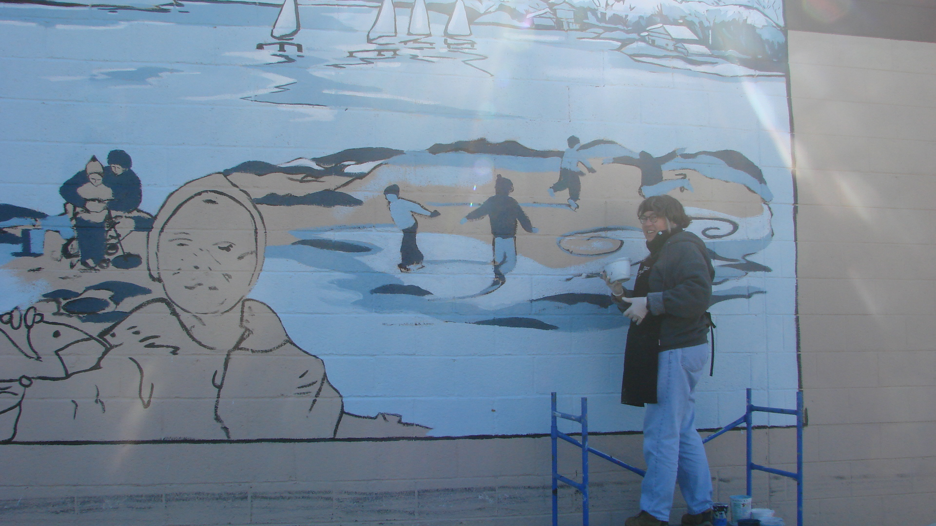 This public mural project was a community wide, grass roots initiative.  After TTM was selected for the project, and the design approved by the town, Whitmore Lake residence set out to fundraise for this beautiful project.  Many individuals and business pitched in.  After two years of fundraising, in the chilly months of fall, TTM started and completed this 85′ mural on the side of the local National City Bank.